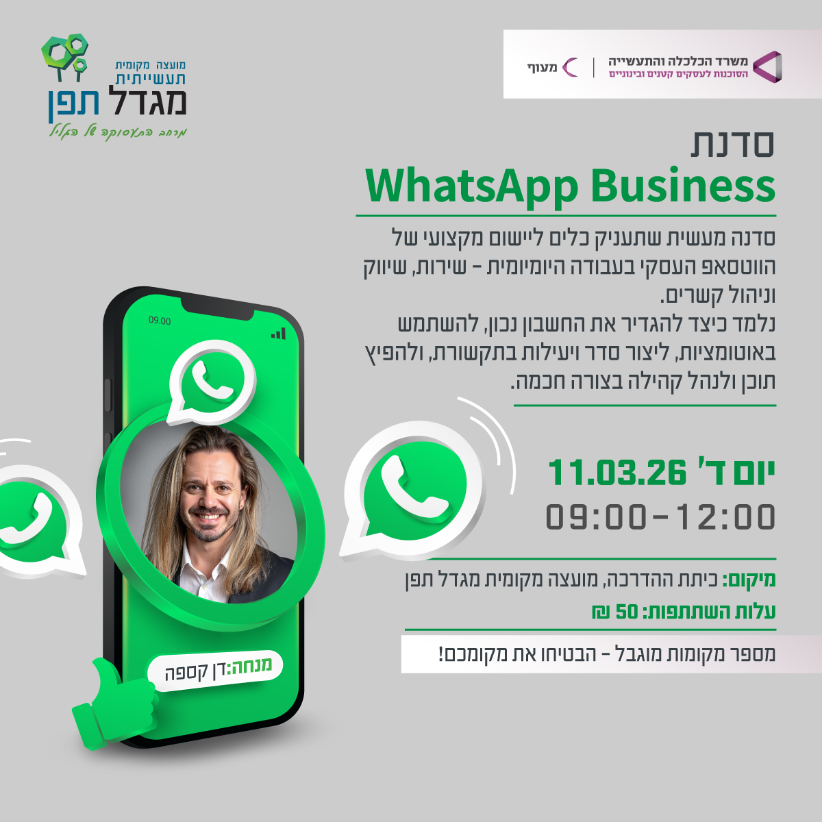 📊 אקסל למתחילים – יסודות וכלים שימושיים 📈 אקסל למתקדמים – פונקציות חכמות ואוטומציה 💻 הביאו מחשב נייד 💰 עלות: 50 ש"ח למפגש ⚠ מקומות מוגבלים – הרשמה מוקדמת מבטיחה את מקומכם! 🔥 אל תחכו – הירשמו עכשיו! קישור להרשמה- סדנאות אקסל מגדל תפן
