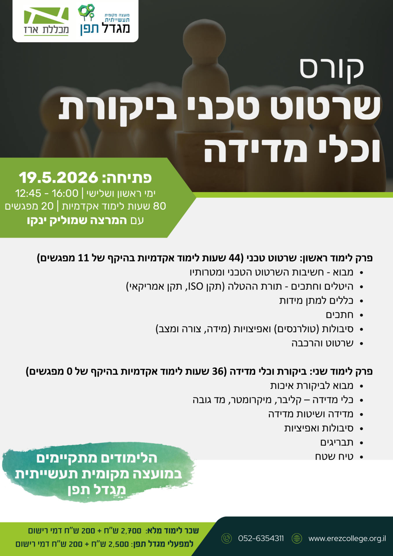 קורס שרטוט טכני, ביקורת וכלי מדידה – 80 שעות אקדמיות (20 מפגשים), הכשרה מקיפה הכוללת קריאת שרטוטים, תקנים, סיבולות, חתכים, ביקורת איכות ושימוש בכלי מדידה מתקדמים.מיועד לעובדי ייצור, תפ"י, הנדסה ובקרת איכות המעוניינים להעמיק ידע ולהתפתח מקצועית.הזדמנות לקידום עובדים, שיפור דיוק תהליכים והרחבת היכולות הטכניות בארגון. בשעות הצהריים – 12:45- 16:00