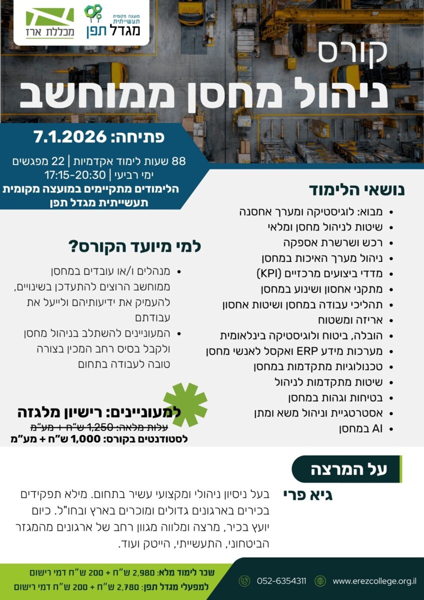 • קורס ניהול מחסן ממוחשב מעניק למשתתפים ידע מקצועי וכלים יישומיים לניהול מחסן מודרני, יעיל וממוקד ביצועים. במהלך ההכשרה נלמדות שיטות לוגיסטיות מתקדמות, ניהול מערך אספקה, שימוש במערכות ERP, עבודה על מדדי ביצוע (KPI), בניית תהליכי עבודה נכונים ושיפור רמות מלאי. הקורס מותאם למנהלים ועובדים המבקשים להתמקצע, להתעדכן ולהוביל שיפור במערך האחסון והלוגיסטיקה בארגון, תוך שילוב בין תיאוריה ליישום מעשי בשטח.